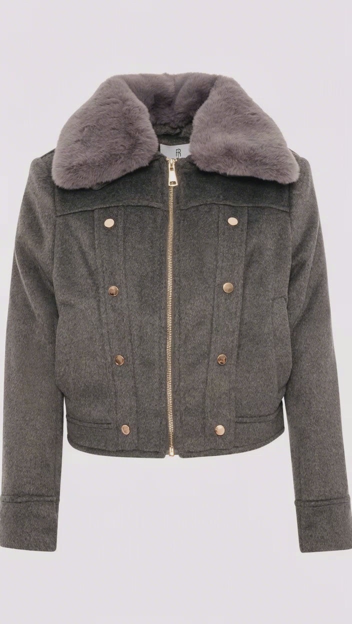 The design blends classic bomber elements with tailored details, such as the cropped cut and boxy fit. The main feature is the soft grey faux fur collar which adds a touch of luxury and warmth. The front closure is a practical gold two-way zipper, ensuring functionality and a bright touch. Four decorative golden buttons, placed in pairs on the front, evoke a military style and enrich the design.